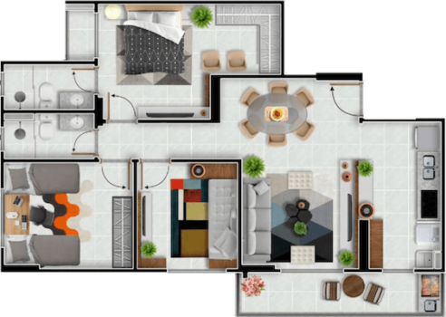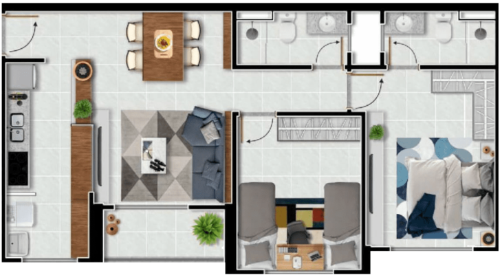 Planta de 2 quartos | 60m²